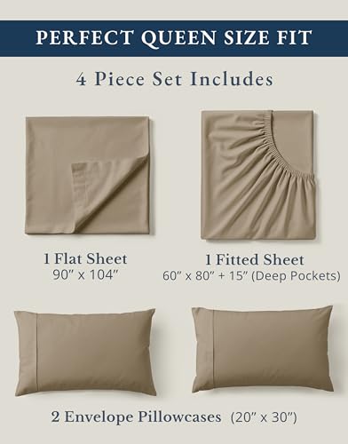 Luxurious 4-piece bedding : Embrace luxury with our meticulously crafted 4-piece hotel quality sheets. Our queen set includes 1 Flat sheet (90″ W x 104″ L)that offers ample coverage, 1 snug queen fitted sheet set (60″ W x 80″ L) designed specifically for a queen mattress having 8″- 15″ deep pocket with all-around elastic and 2 Standard Queen Size Pillowcases (20″ W x 30″ L).